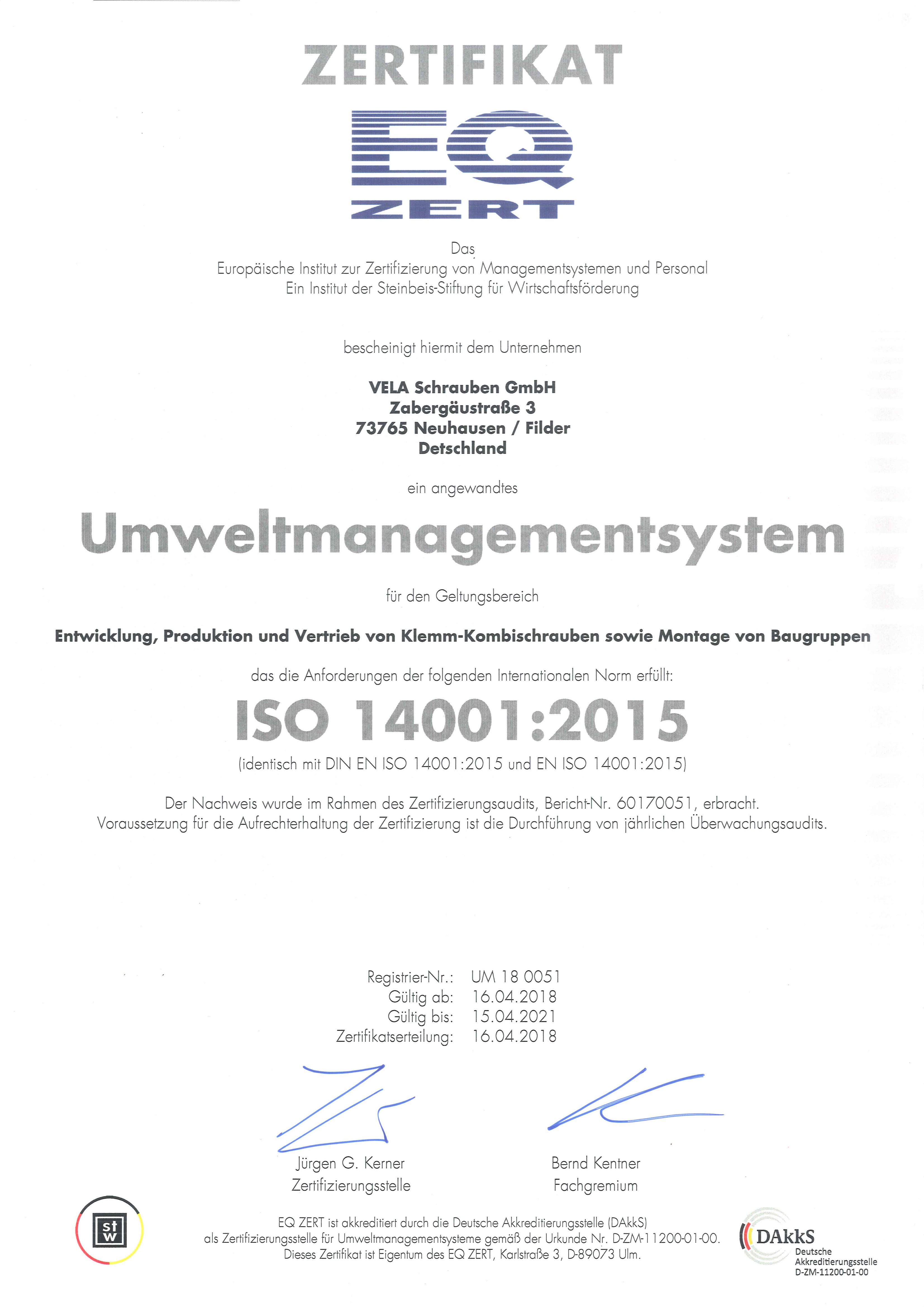 Die VELA Schrauben GmbH ist nach DIN ISO 9001 und DIN ISO 14001 zertifiziert.